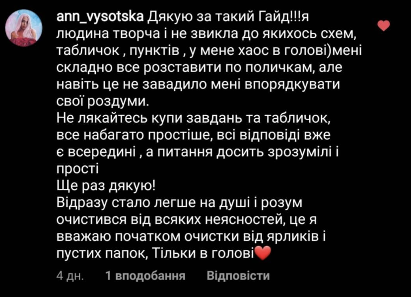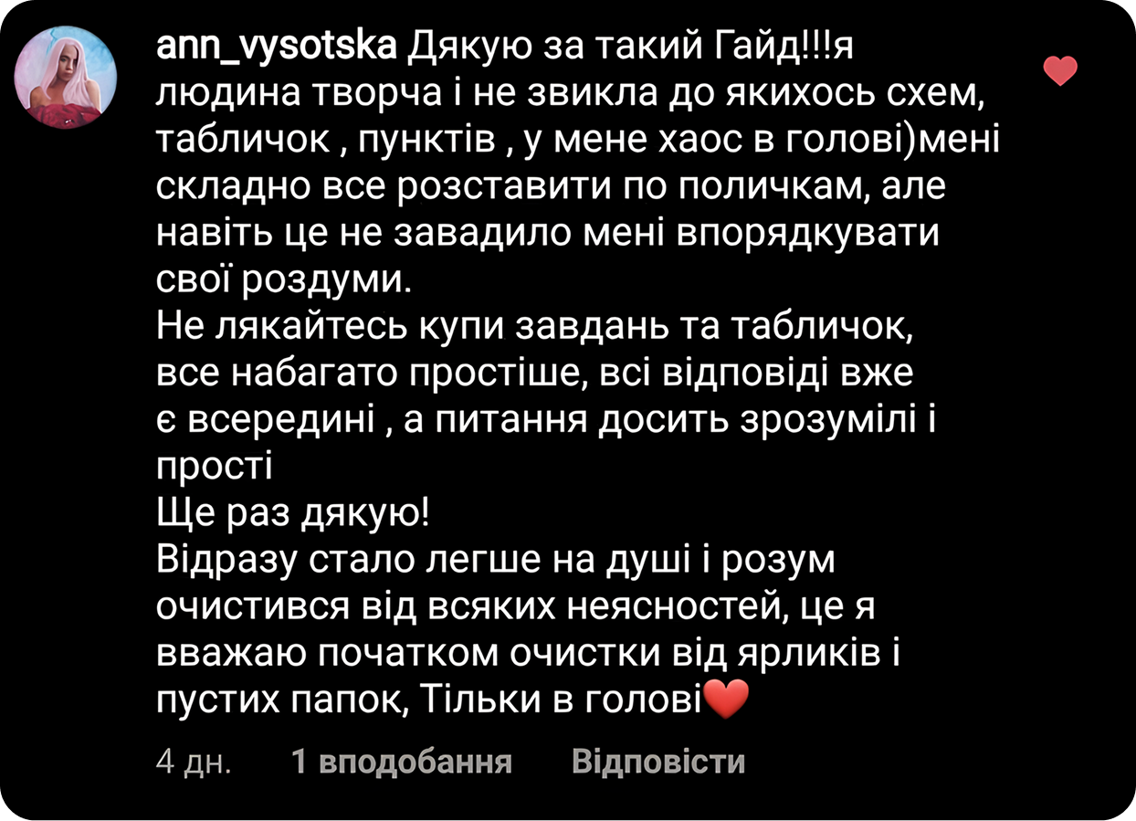 І найголовніше — ти отримаєш цілісне бачення свого життя: де ти є, що варто змінити, і як розумно планувати і свій час, і свої кошти. А вже ті, хто захоче піти глибше і швидше — завжди можуть приєднатись до мого повноцінного супроводу